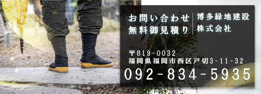 このたびは、当社のホームページをご覧いただき誠にありがとうございます。私たち博多緑地建設は、「自然と大切な家族をつなぐ空間づくり」を理念に掲げ、庭園の設計・施工から、外構・土木工事に至るまで幅広いサービスを提供しております。